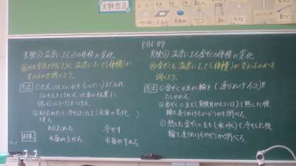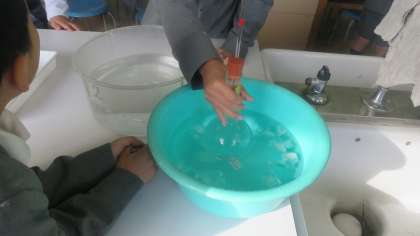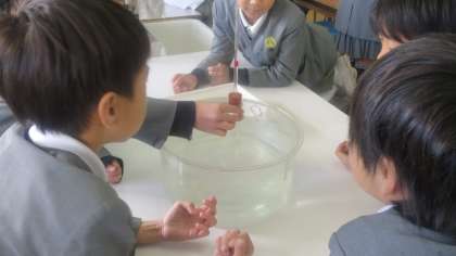 4年生が理科の授業で実験をしていました。丸底フラスコに水をいっぱいまで入れてガラス管つきゴムせんをはめます。丸底フラスコをあたためたり冷やしたりして、ガラス管の中の水面の変化を見ます。先生から実験方法の説明を受けて、みんなで予想を立てます。もちろん、どうしてそう思うのかについて理由も発表していました。