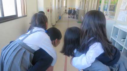 1年生の女の子が6年生のお姉ちゃんにおんぶをしてもらっていました。休み時間に6年生が1年生のところに遊びに来ることがちょくちょくあるようです。1年生は6年生を見つけると走って寄っていきます。手をつないでもらったりぶらさがったり、だっこやおんぶをしてもらったり…。おねえちゃんだーいすき・・・1年生の子はめっちゃ笑顔です。