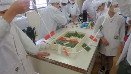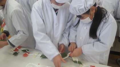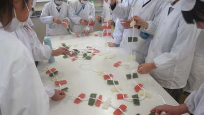 おかき用のおもちを間隔をあけてひもにくぐりつけていきます。こうしてつるしておいて乾燥させるそうです。それから焼くと、おかきになるそうです。子どもたちは3色のおもちを「どんな味なのかな」と想像しながら器用にくぐりつけていました。