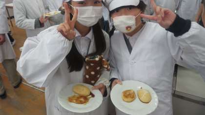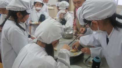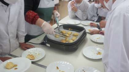 ついたおもちをまるめて、しょうゆにひたします。それからホットプレートでかるく焼いていきます。香ばしいしょうゆの香りが教室内にたち込めます。