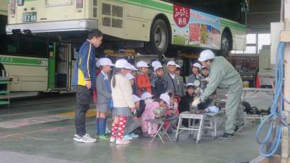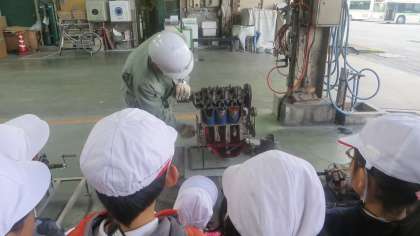 エンジンのしくみも整備士の方がていねいに教えてくれます。少しむずかしい内容だったのですが、子どもたちは「ふ〜ん」といかにもよくわかったかのように首を上下にふってうなずいています。とにかくすごいんだなあということは伝わったと思います。そのあとバスに乗り込んで給油場所へ。車庫内にガソリンスタンドがありました。