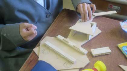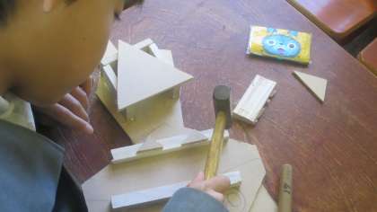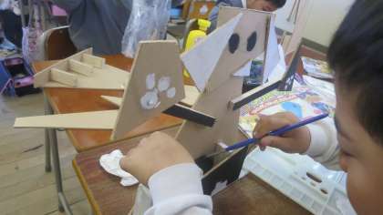 4年生が図画工作の授業で板を加工して作品を作っていました。のこぎりで切った板をボンドや釘で組み合わせていきます。色もぬります。小物入れや飾りなど、使ったり楽しんだりできるものを作っています。自分が考えたイメージのものが上手に作れるかな。