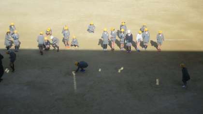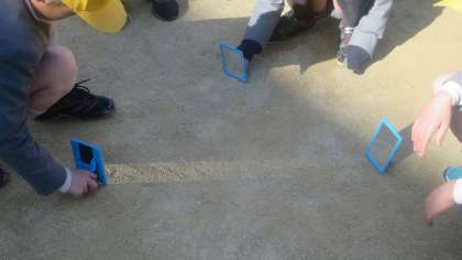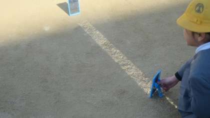 3年生が運動場でかがみを使って、日光をはね返す実験をしていました。またかがみを数枚使って連続はね返しにチャレンジです。これがなかなかむずかしい。子どもたちは「ここかな」「もう少し右の方やで」などと言いながら活動していました。