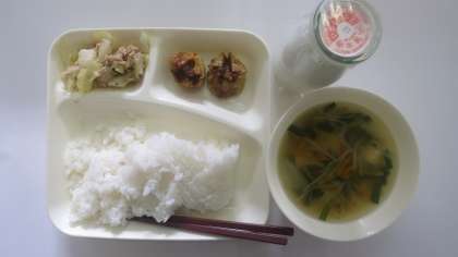 今日の給食のメニューは、揚げシューマイ、えびと豆腐のスープ、ツナとキャベツの炒めもの、牛乳、ごはん、でした。揚げシューマイは肉はやわらかく、皮はパリッと香ばしく上手に揚げられていました。えびと豆腐のスープはさっぱりとした中華スープに仕上がっていて、にらやえびの風味が効いていました。ツナとキャベツの炒めものはしょうゆベースの和風仕立てで、キャベツはしんなりとした感じに炒められていました。