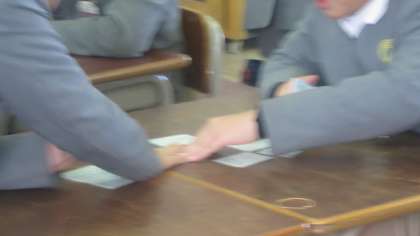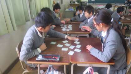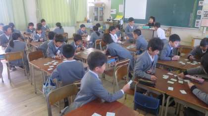 4年生が「百人一首」をしていました。先生が読み手となり、子どもたちが札を取り合います。かるたとちがって、すぐには手がでません。字しか書いていないし、全部同じように見えるので、子どもたちも読んで探すのに必死です。でも見つけたときの動きは素早かったです。