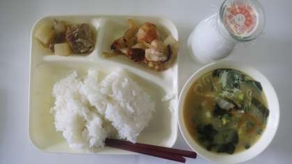 今日の給食のメニューは、鶏肉の甘辛焼き、みそ汁、大根の煮物、牛乳、ごはん、でした。鶏肉の甘辛焼きはてりやき風の仕上がりで、皮はこんがり焼き目がつき、肉はやわらかく食べやすかったです。みそ汁はだしがしっかりととられていて、じゃがいもはホクホクしていて具だくさんでした。大根の煮物は大根は冬瓜のようにやわらかく味がしみていて、とろみ具合もちょうどよく、おいしかったです。