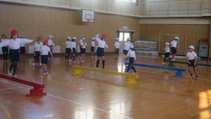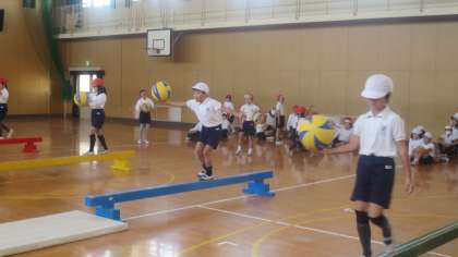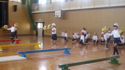 3年生が体育の授業で平均台を使っていました。うまくバランスをとりながらソロリソロリ。なれてくるとスピードアップ。平均台の真ん中で一回ぐるりと回ってから着地はきめポーズ。いろんなわたり方にチャレンジします。つづいてボールを1こ、そして2こ…、うまくバランスをとってスイスイ進みます。