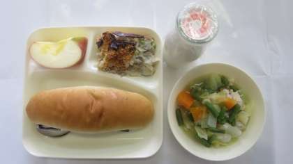 今日の給食のメニューは、鶏肉とじゃがいものスープ煮、きのこのドリア、りんご、牛乳、パン、でした。鶏肉とじゃがいものスープ煮はさっぱりとしたチキンスープに仕上がり、やわらかく煮られた鶏肉や野菜が色とりどりで見た目にもきれいでした。きのこのドリアはしめじ、エリンギ、マッシュルームの三種のきのこの食感が楽しめました。クリーミーなソースに具材が包み込まれていて、まろやかでボリューム感もありました。ほどよい焦げ目が香ばしかったです。りんごは冷えていて甘かったです。