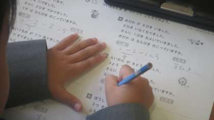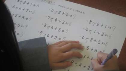 1年生の子どもたちが「3つのかずのけいさん」に取り組んでいました。式ばかりがのっている問題プリントや文章問題プリントに取り組んでいました。まずはじめの二つの数を計算してから、3つめの数をたしたりひいたりしていました。みんながんばっていましたよ。