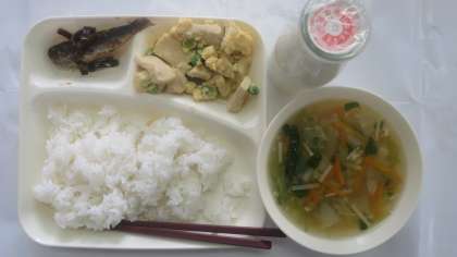 今日の給食のメニューは、いわしのしょうが煮、うすくず汁、高野豆腐の卵とじ、牛乳、ごはん、でした。いわしのしょうが煮は昆布としょうがの香りが効いていて、しょうゆベースのだしでしっかりと煮られれているので、身もやわらかく骨ごと全部食べることができました。うすくず汁は薄味のさっぱりとした味付けで、さといももやわらかく、ちょうどよいとろみ加減で、いつまでも温かかったです。高野豆腐の卵とじは甘めのだしがしっかりと高野どうふにしみ込んでいて、卵と合わさるとさらにおいしかったです。