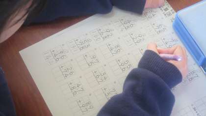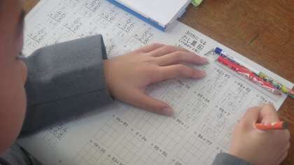 2年生が算数の授業でくりあがりのあるたし算について練習していました。くりあがりが2回あって答えが3けたになります。一の位でくりあがった数を十の位に加えて、十の位でくりあがった数を百の位に加えます。もうみんなずいぶんと慣れてきているようです。少しスピード感も出てきました。でもていねいにすることが一番大切です。間違えないように気をつけてね。