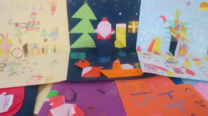 教室の後ろのロッカーの上に手作りのクリスマスカードが置いてありました。あともう少しですね。子どもたちもとても楽しみにしているみたいです。