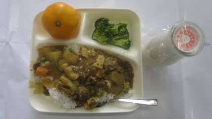 今日の給食のメニューは、冬野菜のカレーライス、ブロッコリーのサラダ、みかん、牛乳、でした。冬野菜のカレーライスはしょうがとにんにくで具材がしっかりと香りづけして炒められていて風味を感じました。ルウのとろみ具合もちょうどよく、まろやかでコクのある仕上がりになっていました。ブロッコリーのサラダはブロッコリーは芯までやわらかく、手作りの和風ドレッシングがおいしかったです。みかんは甘かったです。