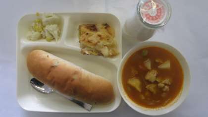 今日の給食のメニューは、鶏肉と野菜のケチャップ煮、カリフラワーとコーンのサラダ、桃のクラフティ、牛乳、パン、でした。鶏肉と野菜のケチャップ煮は鶏肉はワインで下味をつけられていてやわらかく、じゃがいもやにんじんもホクホク感がありました。味付けもしつこくなく、さっぱりとしたトマトスープのような仕上がりでした。カリフラワーとコーンのサラダはわずかに酸味が効いていて口当たりがよかったです。桃のクラフティは桃のやさしい甘みが口いっぱいに広がり、生地もプリンのようにやわらかく高級感漂うデザートのようでした。←これほんと。