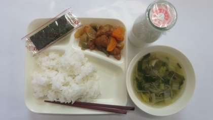 今日の給食のメニューは、酢豚、中華スープ、焼きのり、牛乳、ごはん、でした。酢豚はしょうがの香りが効いていて、衣をまとった豚肉も上手に揚げられていてやわらかかったです。とろみのある甘辛いタレが豚肉にからんで、たまねぎやピーマンもシャキシャキ感を残していておいしかったです。中華スープはしいたけのだしとニラの香りが漂い、さっぱりとした味に調えられていました。