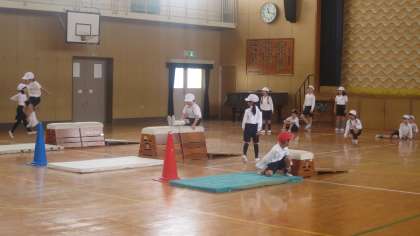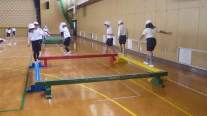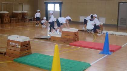 1年生が体育の授業で「跳び箱運動を使った運動遊び」をしていました。跳び箱を工夫して配置し、またぎ乗りやまたぎ下り、跳び乗りや跳び下りなど…、いろいろな跳び越え方にチャレンジしていました。楽しさを意図的に取り入れることで、子どもたちの興味も引き出しています。よい動きができている子がいたら、まわりの友だちに紹介して広めていきます。平均台も利用していました。子どもたちは両手を広げて体のバランスをとりながら歩いていきます。グループごとにそれぞれの運動コーナーを回っていくので、子どもたちも楽しみながら運動することができていました。