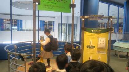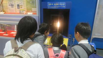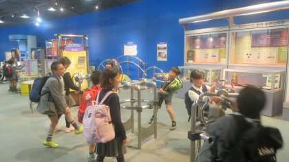 「宇宙や地球」「科学と化学」「電気とエネルギー」などについて、視覚的・体験的に学習することができます。子どもたちはグループで協力しながら見学していました。普段見たことがない装置や楽しそうなコーナーがたくさんあるので、子どもたちはそれら全部を網羅しないと気が済まない感じでしたね。次へ次へと走って移動します。