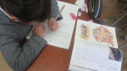 3年生が国語の授業で説明文の学習をしていました。世界のさまざまな場所にある「家」について紹介している文章です。その土地の特徴や人々のくらしに合わせて工夫して作られています。子どもたちは文章を読みながら筆者の伝えたいことを読み取ってまとめていきます。ボリビア、ルーマニア、モンゴル、チュニジア、セネガルといった国が出てくるので、先生が世界地図を映し出し、子どもたちに教えていました。また画像で家のようすやくらしなどについてわかりやすいように示していました。