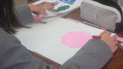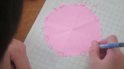 5年生が算数の授業で「正多角形」の学習に取り組んでいました。はじめの導入部分です。先生から正五角形や正六角形、正八角形が印刷されたプリントを配られます。子どもたちはハサミで切り取ってノートに貼り付けて、気づいたことやわかったことなどを発表していました。