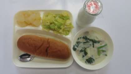 今日の給食のメニューは、ほうれん草のクリームシチュー、キャベツのサラダ、洋なし(缶)、牛乳、パン、でした。ほうれん草のクリームシチューはじゃがいもがホクホクで、にんじんとほうれん草の色が色鮮やかで美しい仕上がりになっていました。特製手作りルウはまろやかでやさしい味でした。キャベツのサラダはりんご酢の甘酸っぱさがキャベツに浸透してさっぱりしていておいしかったです。洋なしは冷えていて甘かったです。