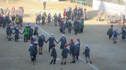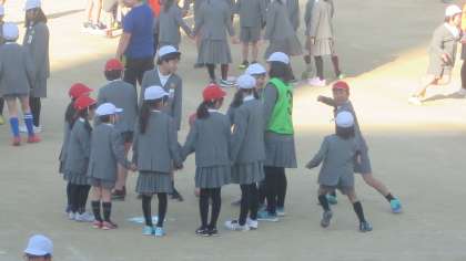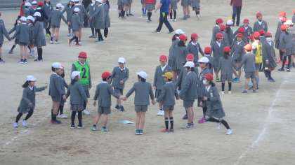 今日の児童朝会は「手きりおに」です。円になって手をつなぎます。おにがその一部を後ろから近づいて「えいっ」ときります。きられた両どなりの子たちは円を一周走って元の場所に戻ってくるのですが、遅かったほうが次の鬼になります。はんかちおとしのようなゲームです。子どもたちは寒さに負けず、楽しく元気に遊んでいました。