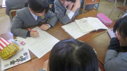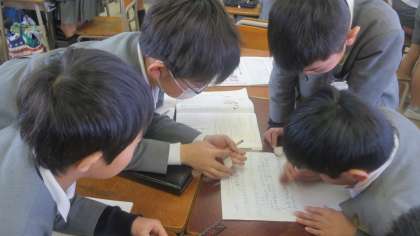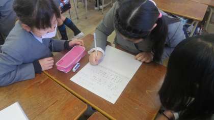 4年生が国語の授業で「報告します、みんなの生活」という単元を学習していました。そこでみんなが興味を持っていることやみんなの生活についてアンケートをとって調べることにしたようです。グループでアンケートづくりをしていました。教科書の例を参考にしながら、テーマを決めて質問を考えたり回答欄を作ったり…。わかったことは絵や図表、グラフなども使って効果的にまとめます。うまく報告できるといいですね。