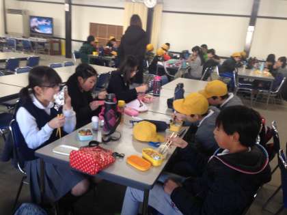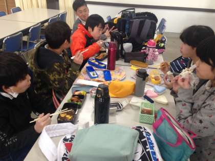 ちょっと早めのお弁当です。グループで食べたい時間に休憩所にやってきて食べます。早いグループは11時半くらいにきて食べていました。お腹がすいたんですね。後半に備えてしっかり腹ごしらえします。