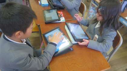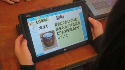 3年生が社会の授業で「昔のくらし」について調べていました。どんな道具を使っていたのかな、どんなふうに進化してきたのかな、苦労していた部分や便利になった部分はどこかな…、などについてタブレットを使って調べていました。グループごとにテーマが決まっていて、お互いに調べたことやわかったことを伝え合っていました。
