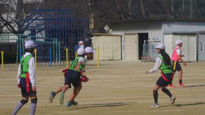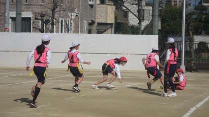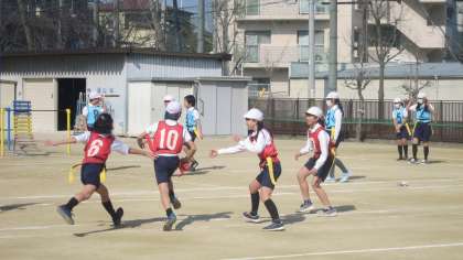 6年生のフラッグフットボールも回を重ねるたびに様になってきました。自分たちで考えた作戦を練習で何度も試し、ゲームに生かせるよう取り組んでいます。ボールを持っている子の動き、それに対するフォローの動き…、相手を惑わせるためにはどうすればいいのかについて思いつきではなく論理的に作戦を立ててトライしている姿を見て、さすが6年生だなあと思いました。うまくいったときは喜び、うまくいかなかったときはふり返ります。体育では体力の向上だけにとどまらず思考や判断の育成も求められているので、まさにその目標も達成できているなあと思いました。