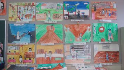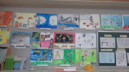 6年生の教室の後ろに絵画の作品が掲示してありました。将来、自分がこんな風になっていたらいいな、きっとこんな風に活躍しているだろう…、などと将来の自分を思い浮かべて描きました。一人一人に夢があって、それぞれステージは違うけれど、どれもいきいきと個性豊かに表現されていました。