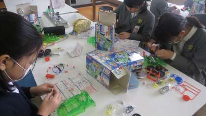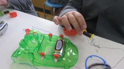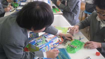 5年生が理科の授業で「電磁石のはたらき」について学習しています。最終的には電磁石の力で車を走らせるという教材を使って学習していきます。
