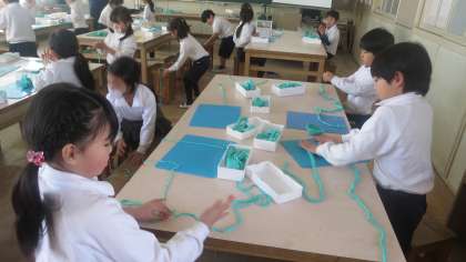 次は友だちとつなげてもっと長くしたり、お花をつくったり生き物をつくったり…。何をつくろうかなぁ…、同じ机の友だちと相談しながら、楽しそうに活動していました。