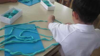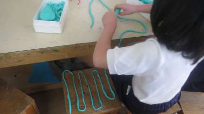 1年生が図画工作科の授業でねんどを使っていました。テーマは「ひもひもねんど」、造形遊びです。まずねんどをコロコロまわしながらひも状にしていきます。どんどんどんどん長くなっていきます。