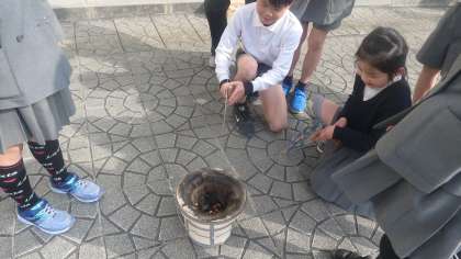 3年生が七輪体験をしました。うまく炭に火をつけられるかな。木切れと新聞紙を入れて、そして炭も入れました。みんなで順番にうちわであおぎます。