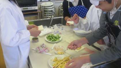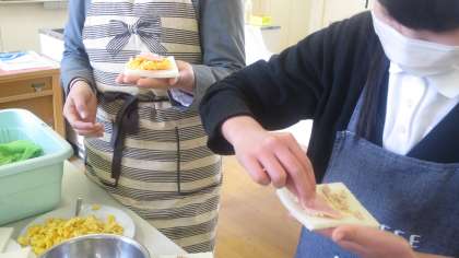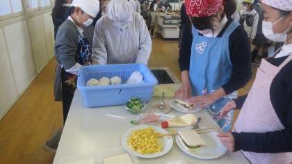 昨日に続いて、6年生のもう一つの学級が調理実習を行いました。サンドイッチです。子どもたちは楽しみにしていたようで、朝からどの子も笑顔です。パンにはさむ具材を準備していきます。まずたまごを焼きます。薄焼き卵やゆで卵マヨネーズ、いり卵…グループによってちがいます。ハムやきゅうりの切り方、ツナの下味のつけ方…、みんなで協力して進めていました。さすが6年生ですね。動きがてきぱきとしていました。