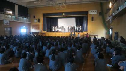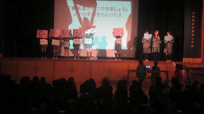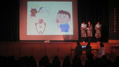 今日の児童集会は保健委員会の発表でした。虫歯の予防についてです。春の検診で治療を進めるプリントをもらった人数や歯医者に行って治療を行った人数などが伝えられました。それから「あいうべ体操」というものが紹介されました。
