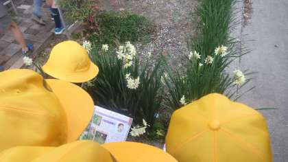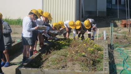 1年生の子どもたちが「はるのくさばな」をさがしています。お目当ては「ホトケノザ」「オオイヌノフグリ」「ハルジオン」…などです。オオイヌノフグリは見つけられました。もう少ししたらもっと見つかるかもしれませんね。