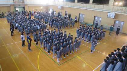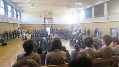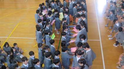 本日、土曜授業で「6年生を送る会」が行われました。4年生、5年生の児童会の子どもたちが中心となって進めていきます。児童代表のことばから始まり、1年生から5年生の各学年からお祝いや感謝、エールのメッセージが述べられ、続いて元気いっぱいの歌や感動を誘う歌が講堂内に響き渡りました。またリコーダーによる演奏なども発表されました。きっと6年生の子どもたちは小学校生活6年間をふり返りながら聞いていたと思います。どの学年の発表も6年生への思いがたくさん込められていました。1年生からは在校生みんなで書いた「お祝いメッセージカード」が6年生に手渡されました。