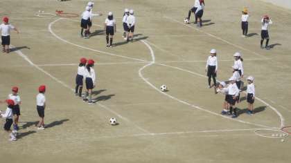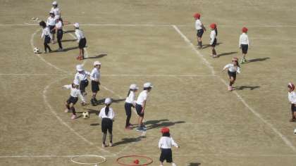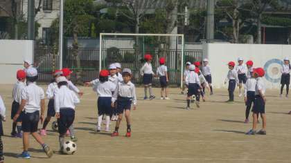 陽射しはあるものの、少し寒さが感じられる中、1年生の子どもたちが元気いっぱいに運動場で活動しています。「たまごわりサッカー」というボールけり遊びです。得点が入ると、とびはねて喜んでいるようすがとてもかわいらしかったです。