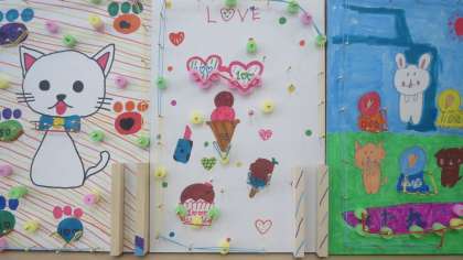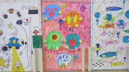 3年生の教室の後ろのロッカーの上に、工作の作品が並べてありました。ビー玉で遊ぶコリントゲームです。台板に自分の好きな絵を描いて、くぎをうちつけていきます。くぎとくぎの間に輪ゴムをかけて、ビー玉の通り道や入賞部分などをつくったりします。3年生の子どもたちがなれない手つきで、一生懸命にくぎをうっている姿が目に浮かんできました。あとでみんなで遊ぶのかな?