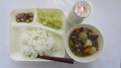 今日の給食のメニューは、肉じゃが、はくさいの甘酢漬け、とら豆の煮物、牛乳、ごはん、でした。肉じゃがは牛肉の旨みと脂が強く感じられ、甘めの和風だしで味が調えられていました。じゃがいもははしで軽く割れるくらいのちょうどよいホクホク具合でしっかりと味がしみ込んでいておいしかったです。はくさいの甘酢漬けはほんのりと甘酢っぱさを感じ、さっぱりとした口当たりでした。とら豆の煮物は甘くやわらかく煮られていました。