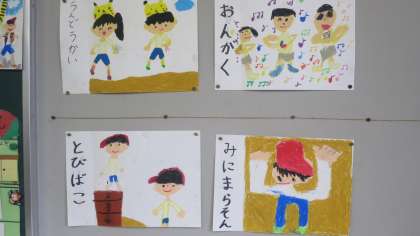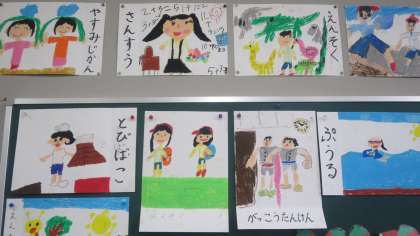 1年生の教室の後ろに絵が掲示してありました。見てみるとどうやら一年間の学校行事や学習の中で楽しかったことや思い出に残ったことを絵に描いたようです。かわいらしい絵がたくさんありました。1年生の子どもたちもこの一年間で本当に大きく成長しましたね。いろいろなことができるようになりました。