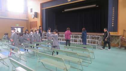5年生の子どもたちが卒業式に向けて講堂にいすを並べました。いよいよ本格的に練習が始まります。今まで5年生、6年生別々に練習していましたが、来週からは合同で練習をしていきます。入場た退場、呼びかけや歌、証書授与、起立、礼、拍手…やることはたくさんあります。約90分間の間よい姿勢も保たなければいけません。集中力を高めてがんばってほしいと思います。
