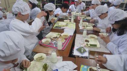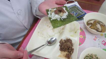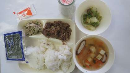 今日の給食のメニューは、手巻きご飯(牛肉の甘辛煮、ツナソテー)、すまし汁、和なしのまっ茶クランブル、海苔、ノンエッグドレッシング、牛乳、でした。手巻きご飯(牛肉の甘辛煮、ツナソテー)は牛肉がしょうがとにんにくで香りよく炒められていて、手巻きご飯に合うように甘めの味付けになっていました。ツナソテーを合わせるとまた少し違う味になり2度楽しめました。すまし汁は透明感があり薄めの味に調えられていて、しいたけとみつばの香りが効いていました。和なしのまっ茶クランブルは給食では初めてのデザートで、和と洋のエッセンスの両方が混ざり合って美味でした。