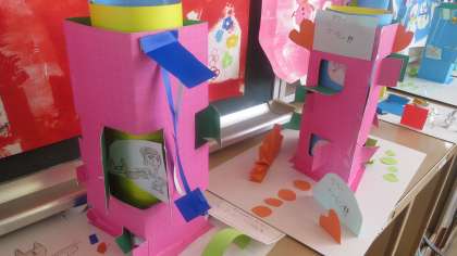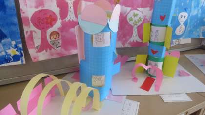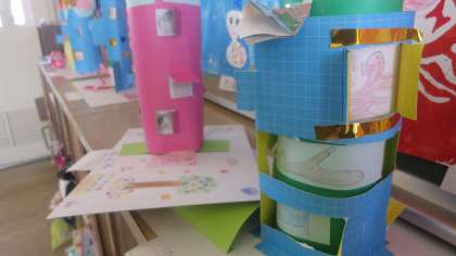 2年生の教室の後ろのロッカーの上に図画工作科の作品が並べてありました。テーマは「まどをひらいて」です。先日より2年生の子どもたちがカッターナイフの使い方を学習していたのはこれのためだったんですね。色のついた厚紙を窓わくのように切り取ったり開くように工夫したりして、その中に部屋をつくったり住人を住まわせたり…。夢のあるたてものができていました。