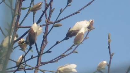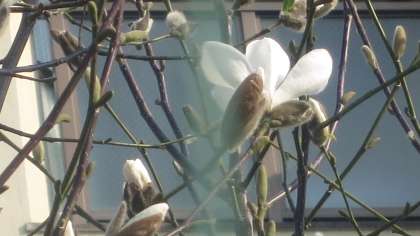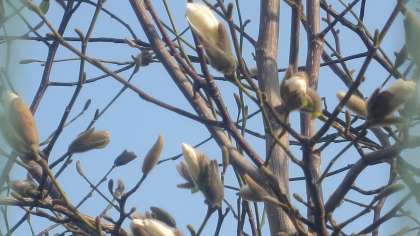 運動場側の歩道にある木にこぶしの花のつぼみを見つけました。一つだけ開いていましたが、あとはまだ全部つぼみです。つぼみが開く直前の形が子どものにぎりこぶしに似ているところから名前をつけられたという説があります。春を告げる花の一つです。
