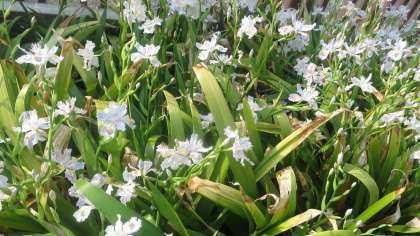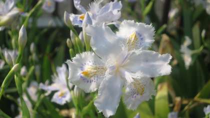 学習園のすみにシャガの花が咲いていました。シャガの花はアヤメ科で常緑性の多年草で、日本に古くから自生し、人里近くで見かけることのできるありふれた花の一つだそうです。でも花びらをよく観察してみると結構複雑で、可憐さがあります。白い花を咲かせて青色の斑点がいくつも入り、中心が黄色く色づいていることが特長です。とてもきれいでした。