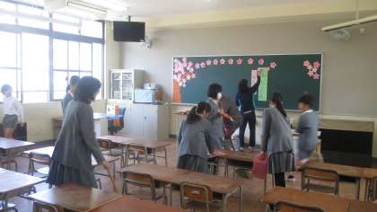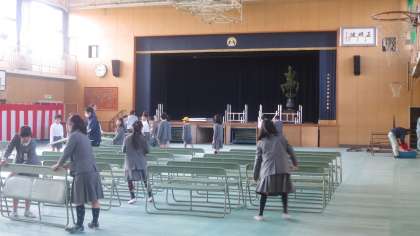 明日の入学式に向けて、新6年生が準備をしています。講堂の椅子ならべや会場設営、新1年生の教室のそうじや飾りつけ、ろう下やトイレなどもです。さすが最上級生、てきぱきと動く姿が頼もしいですね。きっと新1年生のお世話もお兄さんお姉さんとしてがんばってしてくれることと思います。期待していますよ。