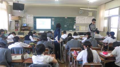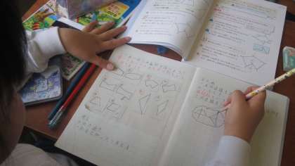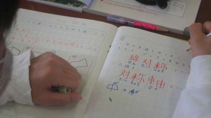 子どもたちはいくつかの提示された図形を見比べたり対称の軸を書き込んだりしながら確認していました。二人の先生が子どもたちの間を回りながら、ていねいに指導していきます。とても落ち着いた雰囲気で学習していました。