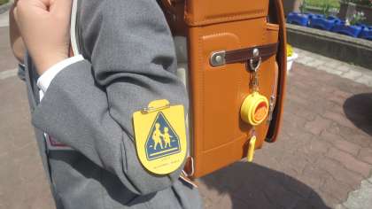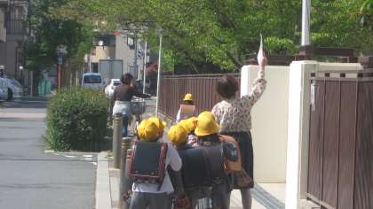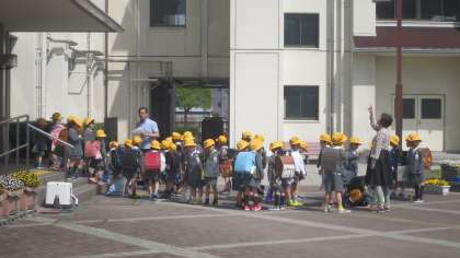 今日もみんなでならんで帰りました。今日から給食が始まったので、2時ごろから帰りじたくです。もう自分のグループはわかっているので、すぐにならべるよ。交通安全の黄色いワッペンと防犯ブザーはみんなおそろいです。それじゃあ、また明日ねー。今日は校長先生も一緒に帰ります。「もうすっかりさくらの花が散ってしまったね」なんて話しているのかな。